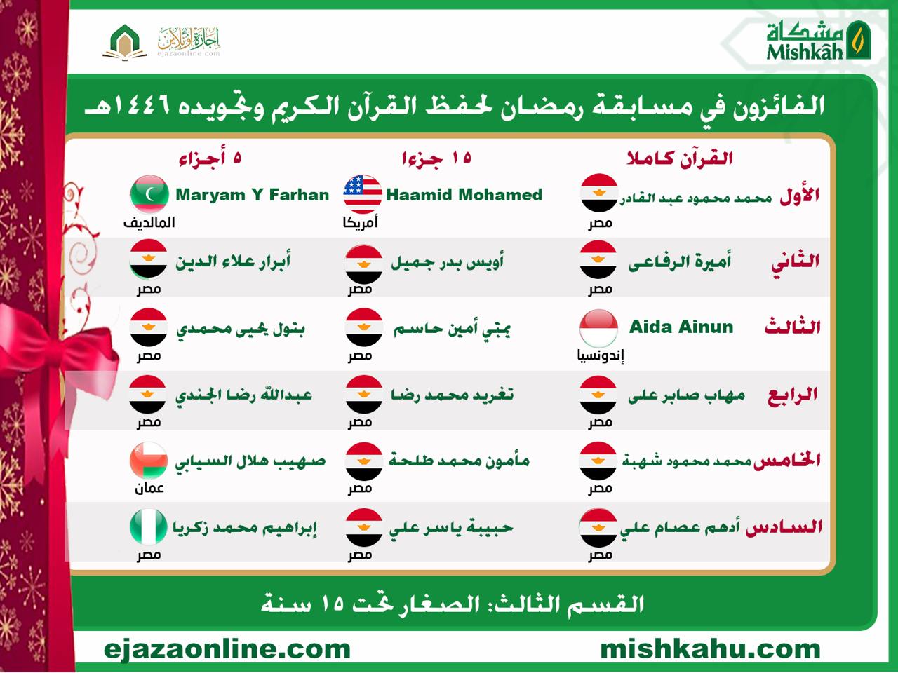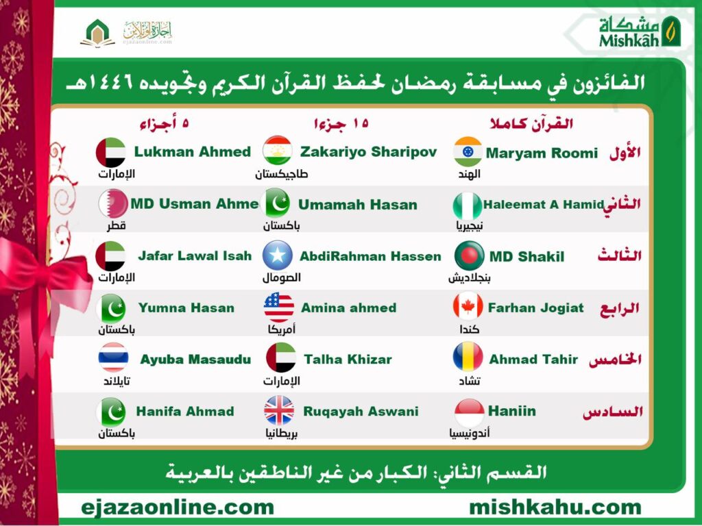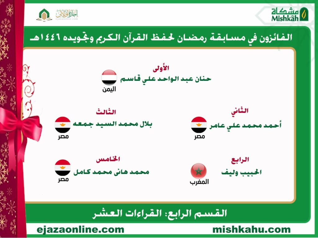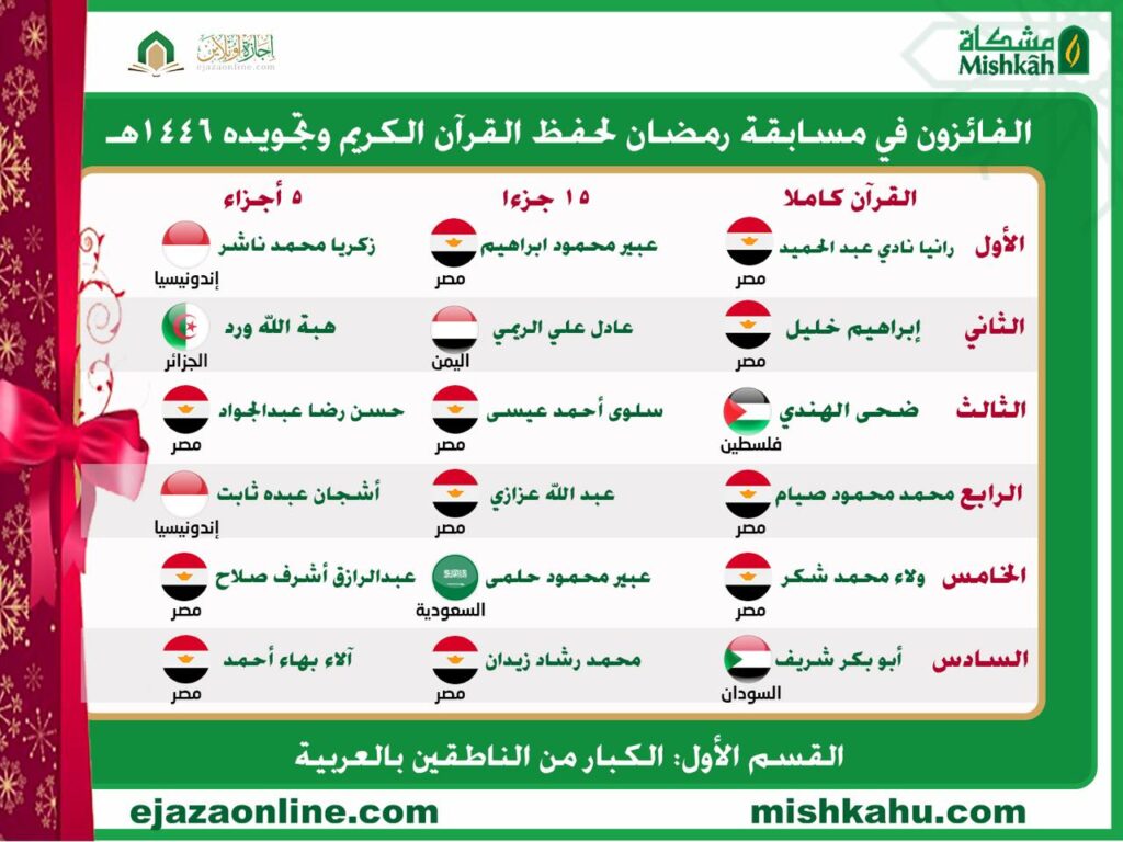الفائزون في مسابقة رمضان لحفظ القرآن الكريم وتجويده لعام 1446 هـ – 2025 م Tweet الصفحة السابقة نتيجة مسابقة القرآن الكريم مارس 27, 2025 الصفحة التالية First stage qualifiers 6 ابريل, 2025 ربما تهتم ايضا بالاخبار التالية دراسة محور التاريخ والحضارة 10 سبتمبر, 2025 مناقشة رسالة الماجستير للباحثة هديل محمد عبد العظيم 31 أغسطس, 2025 تم فتح باب التسجيل لفصل الخريف 1 يوليو, 2025